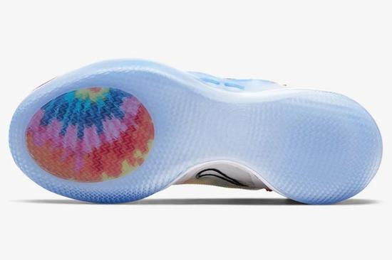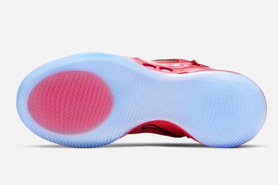 大底依旧采用了淡蓝色的透明水晶大底,但不同于Nike Adapt BB 1.0的水波纹状的大底纹路,Nike adapt BB 2.0采用了更加细密的人字纹路,能够极大地提高抓地力,同时透过水晶大底可以清晰地看到搭载在前掌的Zoom Turbo气垫单元。但透明水晶底容易吸灰这一特性可能还是没有办法得到完美的解决。