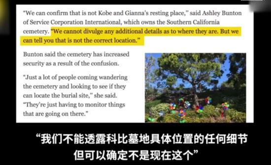 该墓主人生前喜欢紫色和金色的鲜花,后人们为了寄托哀思,就在坟墓上摆上金色和紫色的鲜花,结果美国媒体因为不知道老科的坟具体位置,就在陵园里团团转,到这一看,“哟!”,这不意味着湖人的“紫金王朝”吗?于是乎,一通乱写,好多人还真以为这就是科比的坟墓,这下可好,无数人蜂拥而至。