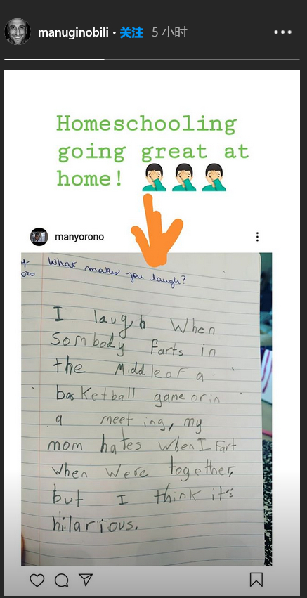 北京时间3月2日,前马刺球星马努-吉诺比利媳妇晒出孩子写的作业,问题是“什么会逗笑你?”