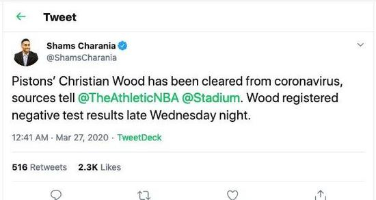 北京时间今日凌晨,著名记者Shams透露,底特律活塞中锋伍德的最新一次检测结果已经出炉,阴性!这也标志着伍德已经正是痊愈!