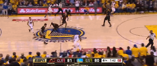 这时候比赛还有30秒,其实勇士依旧有机会。其实的最后一击又发到了后场的欧文手上,欧文面对汤普森的防守一路突进内线,这时候汤普森已经被甩开身位,格林扑上来补防,詹姆斯空切篮下,高高跃起,做了一个战斧劈扣的动作,被犯规,罚球!詹姆斯是怎么空切进去的呢?当格林补防时,一哥往底线乐福的方向移动了一点点,詹姆斯加速冲进内线接球造杀伤。现在我们也许会说,一哥没必要啊,乐福整场三分3中0,也没有大心脏的表现,欧文的出球能力也不能让他横传底角,当然应该死守老詹啊!