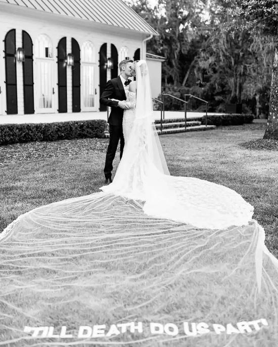 婚纱拖尾上,用 Virgil 代表性的标语设计写出 “TILL DEATH DO US PART(至死不渝)”,可谓当下最有牌面的顶级定制款。