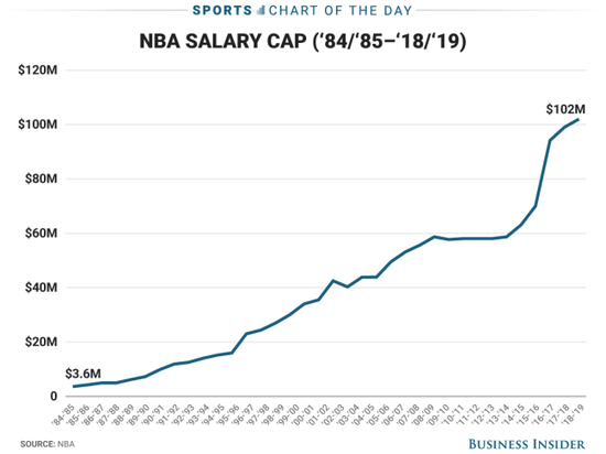 在1994年,雄鹿给一场没打的新秀“大狗”罗宾逊都开出了10年6800万合同,当年乔丹的年薪不过400万,NBA的合同就像中国楼市一样,连年创下新高,94-95赛季,NBA工资帽是1596万,95-96赛季就涨到2310万,一年涨了44%,只见新人笑,谁闻旧人哭?