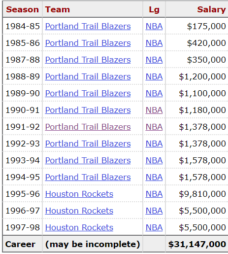我们可以横向对比一下其他联盟一线球星的年薪就知道皮蓬当初赚的不少了。91-92赛季,当时西部的全明星后卫,后来率领开拓者杀入总决赛的德雷克斯勒,年薪137万,作为球队的当家球星,薪水排全队第四。全联盟薪水超过皮蓬的,一共只有16名球员而已。