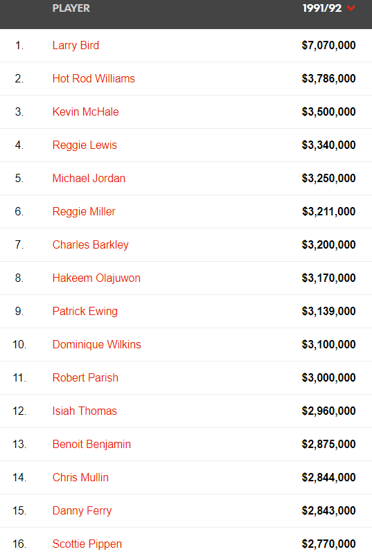 其次,当年皮蓬这份合同,可以说一点也不小了。91-92赛季皮蓬拿277万的年薪,乔丹325万,而当年的NBA工资帽是1250万,皮蓬的年薪相当于占工资帽22%的水平,以现在版本的劳资协议,第一份新秀合同后能拿到的顶薪也就工资帽的25%,皮蓬当初这份合同,完全是符合他当时水准的。