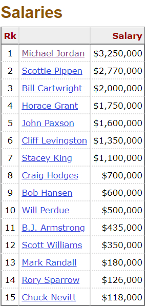 更值得注意,纪录片里没提到的一点是,皮蓬的合同在1991年签的时候本来是5年的,可是在91-92,92-93赛季中间两次公牛和皮蓬商议上调了皮蓬的工资,在92-93赛季,皮蓬343万美元的薪水排在全联盟第八。