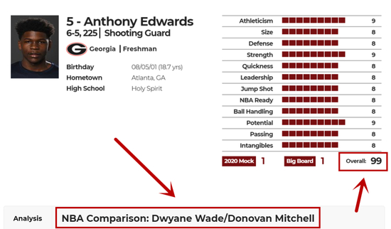 在选秀网站nbadraft上,爱德华兹的评分是99分,预测顺位是第一,他的模板被认为是韦德和米切尔,两人都是身体劲爆、速度一流、爆发力极强的得分后卫,其中韦德是未来名人堂球员,米切尔也在本赛季入选了全明星——可以看出来,媒体对爱德华兹的期待还是挺高的。