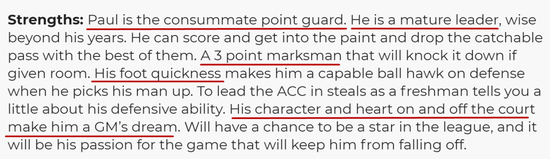 你可以看出来,当时对保罗的优势形容相当准确——保罗就是一个天生的控卫,哪怕如今34岁了,他依然是处于联盟一线控卫行列,而且他的投射能力也非常出色,好胜心也极强。而在劣势上,对保罗的防守评价不太准确,作为一个巅峰时常年防守一阵的球员,直到现在,保罗都还是现役最好的小防大球员,不过有关他的身高缺陷确实也是真的,这一点被当作保罗生涯的“硬伤”。