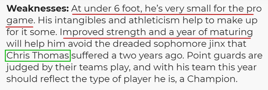而在劣势上,对保罗则是这么形容的:保罗的身高不足6英尺,在职业联赛里已经算非常小个了,不过他的其他优势和运动能力可以弥补一些身高不足;需要提高力量水平,这样才能避免两年前克里斯托马斯的悲剧——克里斯托马斯是圣母大学的球员,大学时期非常辉煌,是NCAA历史上唯三的2000分+800助攻球员,不过因为身高、力量上的不足,克里斯托马斯最终落选了NBA。