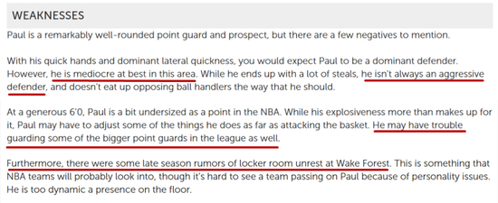 在另一份选秀报告当中,对保罗的缺点形容则更加具体,尤其是在防守端:他的手速和横移速度很快,因此你可能会认为保罗是一名出色的防守球员,不过他在这方面其实并不强,他不会是一个有侵略性的后卫,他可能会防不住联盟里一些比他高大的控卫。