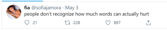 同时,在推特上,索菲娅是这样说的:“人们总是无法意识到他们说出来的话会有多伤人。”
