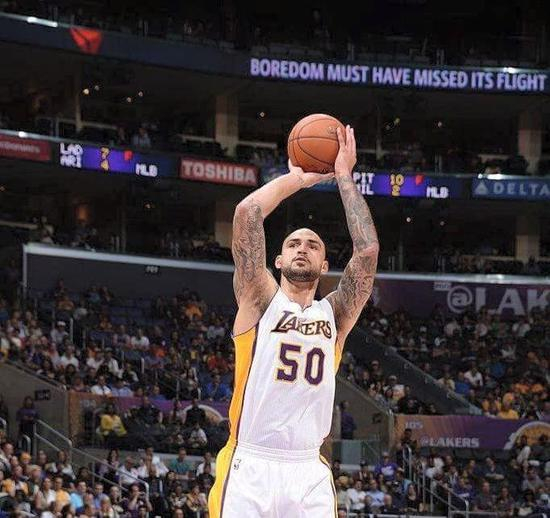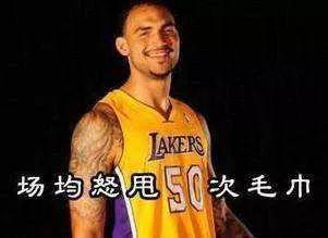 2012年,第二轮第60顺位被选中,4年湖人生涯,189场常规赛,35场首发,场均14.5分钟上场时间,4.2分3.1篮板0.7助攻,命中率为43.6%。这是萨基石NBA生涯交出来的成绩单。但和数据不相匹配的是他的人气,毕竟他的作用不在于拿多少分,我们常用他一场比赛挥了多少次毛巾、递了多少次水,来概括他的价值。于是,才有了这张图片: