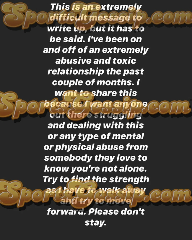 “写下这一段文字对于我来说是极其困难的,但是这不得不说的是,在过去的几个月中,我曾遭遇了极其恶劣以及糟糕的关系。我想要去分享这些是因为我仍然希望能够从这段关系中挣脱出来,因为这伴随着无论是精神还是身体上的虐待,即使他们知道你不是孤单一人。我试图想要寻找一种力量让我摆脱并且尝试着向前。请不要再呆在这里了。”
