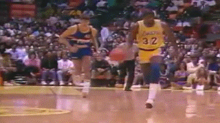 魔术师约翰逊,作为詹姆斯的模板,他五摘总冠军的成就足以成为湖人队史的标杆,2米06的身高,200斤的壮汉居然司职控卫,这已经是不少球迷的知识盲区了,而当人们发现场上的约翰逊可以打通五个位置时,就更对其操作叹为观止了。
