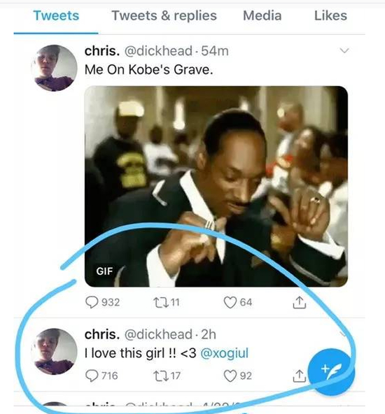 然后吃瓜群众的大显神威,把女孩的社交账号翻了个遍,找到了另外一个叫做chris。的账号,他在字母哥账号被盗前,发布了两条信息,第一条是:I love this girl !!<3@xogiul;另一条的内容则是:我在科比葬礼上蹦迪。