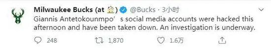 字母哥弟弟科斯塔斯为黑客在字母哥账号发表的不当言论道歉,并表示字母哥的社交媒体、手机、邮箱、银行账号全部被盗。