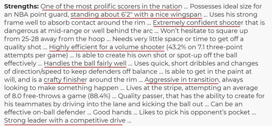 在当时,知名选秀网站nbadraft给他的评分是96分,他的跳投能力、速度是9分,防守、传球则只有7分,这个评分不算特别低,但也不算特别高。