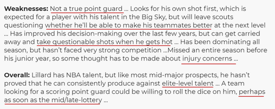 选秀报告同样表示,利拉德确实拥有NBA级别的天赋,但是像很多球员一样,他的天赋还没有到精英级别,如果一支球队需要寻找进攻型的控卫可以考虑他,可能会在乐透区中后段被选中——以这个说法来看的话,第六顺位对于利拉德甚至有些高了。