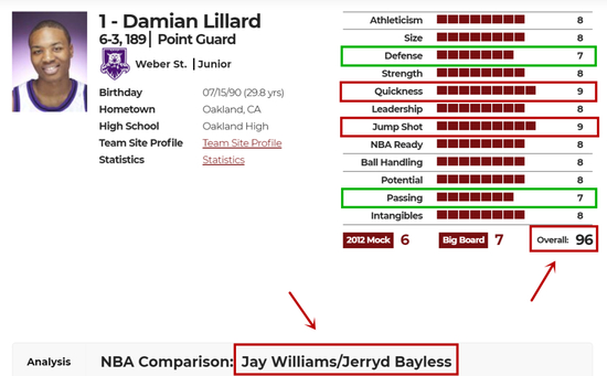 你可以看出来,球探对利拉德的整体评价还是非常不错的,他在大四赛季场均可以拿到24.5分5.0篮板4.0助攻,这种表现在NCAA确实可以用“统治级”形容,同时他的投篮能力也是优势,整个大学时期三分命中率38.8%,罚球命中率86.0%。不过因为他是大四生,投篮选择有问题,又有一定的健康隐患,所以顺位没有更高——相对来说,利拉德的天赋确实不是精英级别,直到现在依然有不少人认为,利拉德的身高和视野制约了他的上限。