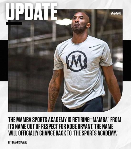 据记者Marc J。 Spears,为了纪念科比,曼巴体育学院决定改名。CEO查德-福克表示,学院决定更名为体育学院,并会“退役”曼巴标志,它会被一直悬挂在学院球馆顶棚,以示对科比的致敬。