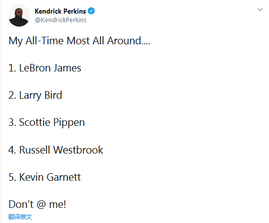 要吹就吹到底。帕金斯最近又在媒体掀起波澜。他在作节目时,列出NBA史上最全能的五人。詹姆斯高居榜首先不说,但是他的榜单中竟然没有“魔术师”约翰逊和维尔特-张伯伦,这就难怪许多球迷要造反了。