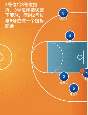 再看战术的跑位演示号,4号位给3号位挡拆,3号位佯装切入篮下接发球,同时2、5号位做一个挡拆配合,目的是吸引对手的防守注意力。
