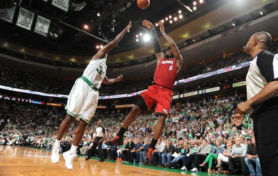 2012年东区决赛,不夸张的说是詹姆斯职业生涯最重要的系列赛,如果再输掉这轮比赛,他几乎将被钉在耻辱柱上,偏偏当年热火队在季后赛遭遇重创,在东部半决赛第一场比赛,波什就因腹部拉伤下场,涉险艰难战胜步行者后,面对凯尔特人热火早早在主场取得2-0的优势,却被凯尔特人连追三场,热火当时几乎一场换一个内线,可无论是图里亚夫,乔尔-安东尼还是哈斯勒姆,都很难阻挡加内特领衔的绿军内线,第六场在凯尔特人的主场进行,这场给球迷也留下了最深的印象,詹姆斯的“死亡之瞳”展示了他超强的求生意志,第六场比赛他从一开始就火力全开,26投19中狂砍45分15板5助。