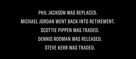 菲尔-杰克逊被换掉;迈克尔-乔丹面临退役;斯科蒂-皮蓬被交易;丹尼斯-罗德曼被解雇;斯蒂夫-科尔被交易。