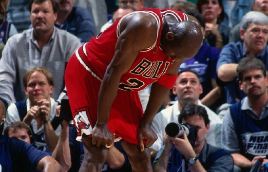 乔丹曾说过自己为了胜利愿意不顾一切,在如此关键的比赛即使严重脱水也要拖着疲惫的身体上场。