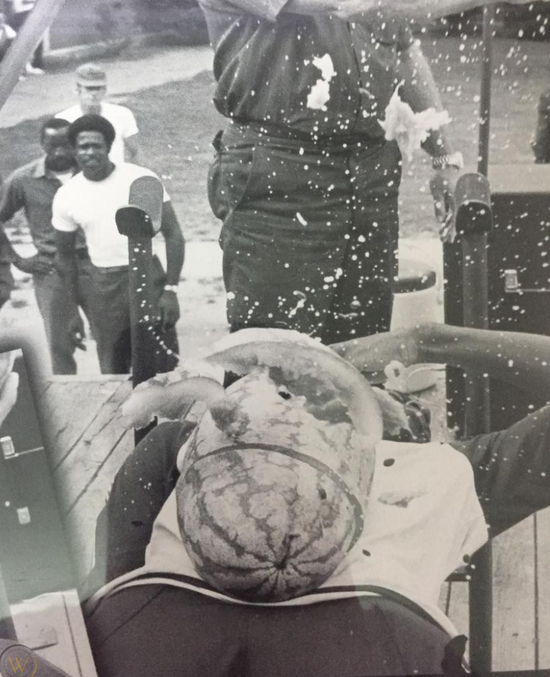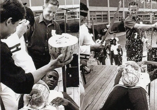 当时,在表演中,备受大家喜欢的还是日本武士刀秀,当时克莱恩要求一位志愿者一起上来表演,表演的内容就是在参与者肚子上放一个大西瓜,然后克莱恩蒙眼切瓜。因此,在大家都不敢上去玩的时候,乔丹竟然自告奋勇上台表示要参与。