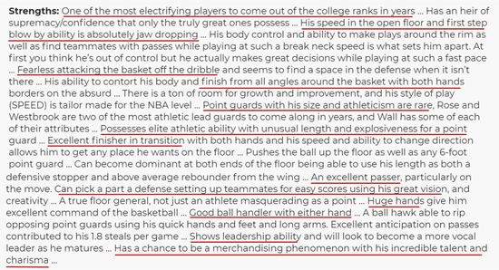 这样一个巨星球员,在2010年选秀大会上也是毫无争议当选了状元,那么回到2010年,在当时人们对沃尔的期待是怎么样?除了速度他还有其他什么优势?劣势又是如何?翻开他的选秀报告,也许我们能够从中找到答案。