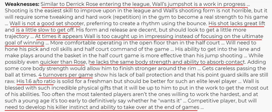 而在劣势上,对沃尔的评价则是:跟罗斯当年一样,沃尔的投篮能力还在改进,投篮是最容易进步的,沃尔的投篮动作还不算糟糕,但需要付出努力;沃尔不是一个很好的定点投手,他更喜欢持球寻找节奏;他的投篮看起来缺少天赋,起跳偏慢;相比胜利,有时候沃尔会更在意个人表现;他在全场进攻时比半场进攻更舒服,需要磨练他的投篮技巧和半场挡拆技术,半场进攻时,他的突破比投篮更高效。