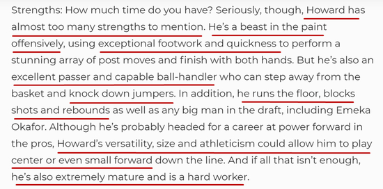 和后来的发展做对比的话,霍华德的运动能力确实不错,他的力量也成功练了出来,不过他的投篮、控球能力并没有这份选秀报告说的那么好——很多人质疑霍华德的背身能力,大伤之后的霍华德背身效率确实堪忧,但是在大伤之前,霍华德绝对是篮下大杀器,巅峰时期的他也绝对是超巨水准。