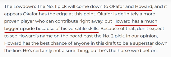 选秀报告同样指出:第一顺位会在奥卡福和霍华德之间诞生,看起来奥卡福可能性会更大一些,因为他已经证明过自己,可以马上为球队做贡献;但是霍华德的上限会更高些;不要指望霍华德掉出前二,在我们看来,霍华德是这届选秀当中最有可能成为超级巨星的球员,他身上有着不确定,但是我们打赌他会打出来。