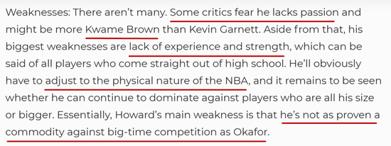 你可以看出来,这份选秀报告对霍华德还是非常肯定的,认为他的技术、速度、终结能力、传球能力、控球能力都不错,甚至还能在外线投篮,不过他的缺点也有,主要在于缺少激情、缺少力量、缺少经验——当时球探们认为霍华德可能会是榜眼,即便如此,他还是这届选秀里上限最高的球员。