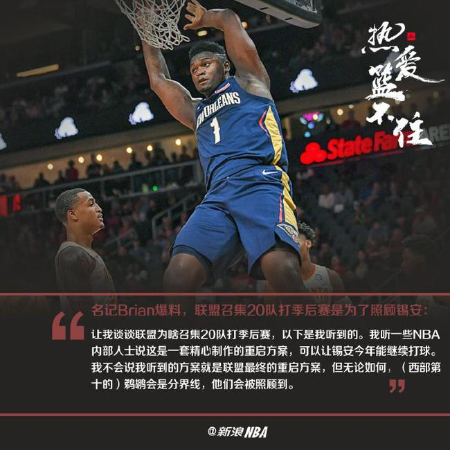 近日NBA复赛方案有了新内容,联盟有意召集20队打季后赛,并将开拓者、鹈鹕、国王和马刺也纳入西区季后赛争8锦标赛中,让这4队也重新获得争夺季后赛名额的机会。相关“阴谋论”也随之一起现身。据名记布莱恩-文霍斯特爆料,联盟出台这套方案,就是为了照顾2019年状元秀锡安-威廉姆森,让他能有机会现身季后赛。