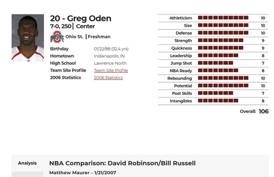 这么说的还有不少,NBAdraft网站当年给奥登打出了106分的高分,他的运动能力,身材,防守,篮板等中锋的重要指标给出的都是10分的满分。他的选秀模板是大卫-罗宾逊和比尔-拉塞尔。关于他的球探报告极尽了赞美之词:令人难以置信的身体天赋,迅猛的速度和爆发力,远超同级别NBA水准的篮下防守和篮板;他的双手柔软又强壮,精神层面是拉塞尔式的领袖并像罗宾逊一样非常谦逊,说话声音都那么温柔和善。