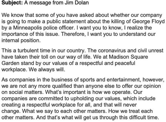 这之后,终于有点坐不住的多兰致信全队,表示尼克斯不会为黑人之死发声:“作为体育和娱乐公司,在社会事件上,我们并不比其他人更有资格发表意见。目前公司的首要任务,就是在内部维持现状,让每个人都能在受尊重的环境下工作。”