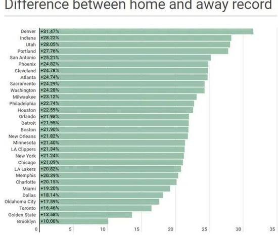 1976年NBL和ABA合并成NBA以来,主客场战绩就很清楚地说明这点。现在的30支球队,无一不是主场球队优于客场。在短时间内,可能会有“客场狂魔”,但在大数据面前,客场胜率永远不可能高于主场。