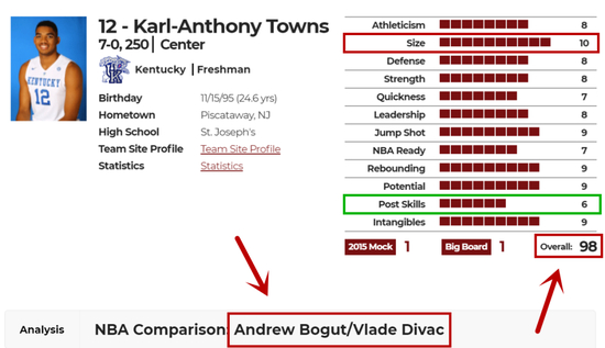 评分上也能看出来唐斯有多么被看好,在当时,知名选秀网站nbadraft给唐斯的评分是98分——2015年的评分系统已经有所改变,98分相当不错了。唐斯的身材是10分,投篮、篮板、潜力则是9分,不过他的背身技术只有6分,速度和即战力只有7分。