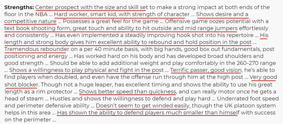 你可以看出来,这份选秀报告对唐斯还是非常肯定的,尤其是在身材、投篮、篮板、传球上,不过也认为唐斯的背身能力不足、爆发力一般,并且因为在肯塔基打球,唐斯的缺点被掩盖了一些——尽管如此,唐斯依然是雷打不动的状元秀,当时在各大选秀网站的预测里,他都是第一顺位。