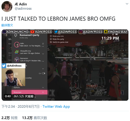近日,一位名为Adin Ross的少年与布朗尼联手,进行了一场NBA 2K的线上直播。最终两人在游戏中4-0横扫对手,并赢得2000美元的奖金。比赛结束后,Adin还获得了与詹姆斯本人通话的机会!
