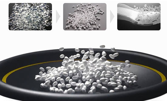 Boost材料主要由发泡热塑性聚氨酯构成,是通过Basf独特发泡工艺加工得到弹性单体。由于结构的独特性,每个小胶囊都能在运动中的每一小步进行有效的挤压、膨胀、反弹,从而聚集并释放能量。它对温度的抵御力比标准的EVA强数倍以上,适应零下的严寒货敢问等严苛的环境,不需要担心鞋中底的性能会下降。