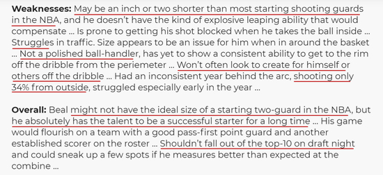 选秀报告同样强调了:虽然比尔没有NBA首发分卫的理想身材,但是他绝对有成为NBA首发分卫的天赋,他可以为一支有着出色控卫和强力得分手的球队效力;不太可能掉出选秀前十,可能会比预期的更好。