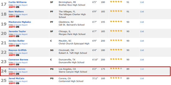 如今ESPN的这份榜单也算是给了我们一个最新的答案,不是同届第一,但是也没那么差,至少是第24位——24位大概是什么概念?自从ESPN给高中生进行星级排名之后,乐透秀基本就在五星高中生里选,布朗尼若不是顶着“詹姆斯儿子”的名号,排在24位也许不会有太多人关注,按照目前的排名,不夸张地说,他距离NBA还很远。