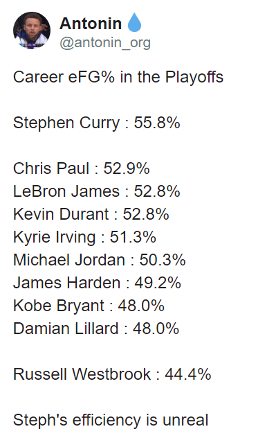 因为没有FMVP的荣誉,史蒂芬-库里的季后赛和总决赛表现总是容易被人所诋毁和看轻。可是篮球数据是球场表现最真实的反映,衡量球员的进攻效率,有效命中率是一项重要的参考值,它的计算公式也很简单,有效命中率=(两分球命中数+1.5x三分球命中数)/总出手数。这样可以更好的量化三分球在场上的价值,比命中率更加科学。