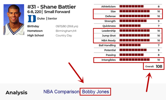 在当时,知名选秀网站nbadraft给巴蒂尔的总评是108分——nbadraft早期的评分普遍偏高,但就算在同期,108分也是非常不错的评价。其中,巴蒂尔的身材、防守、领袖气质、跳投、即战力、更衣室影响力都是满分,不过他的速度、控球只有7分。