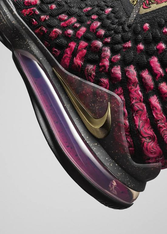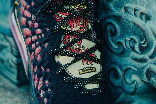 这款LEBRON 17“COURAGE”的配色灵感源于LeBron James球场上的王者风范与中国风。整体以黑色为底色,搭配桃红色纹理,左右丝绸材质的鞋舌上分别刺绣汉字“勇气”与“毅力”,并饰有金红色调的中国龙纹样。