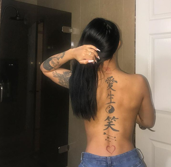 她酷爱纹身,在自己的背上甚至还纹上了汉字“爱、生、笑”。同时,也经常会在社交媒体上大秀身材。