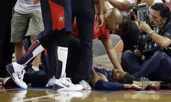 在2014年的夏天,在美国队的一场队内对抗赛中,保罗·乔治在一次追身封盖詹姆斯·哈登的过程中,落地时右腿碰到篮架直接扭曲摔倒,导致胫骨腓骨开放性骨折。当时,保罗-乔治被台上担架的时候,身旁的队友凯文-杜兰特和德里克-罗斯都惊呆了。